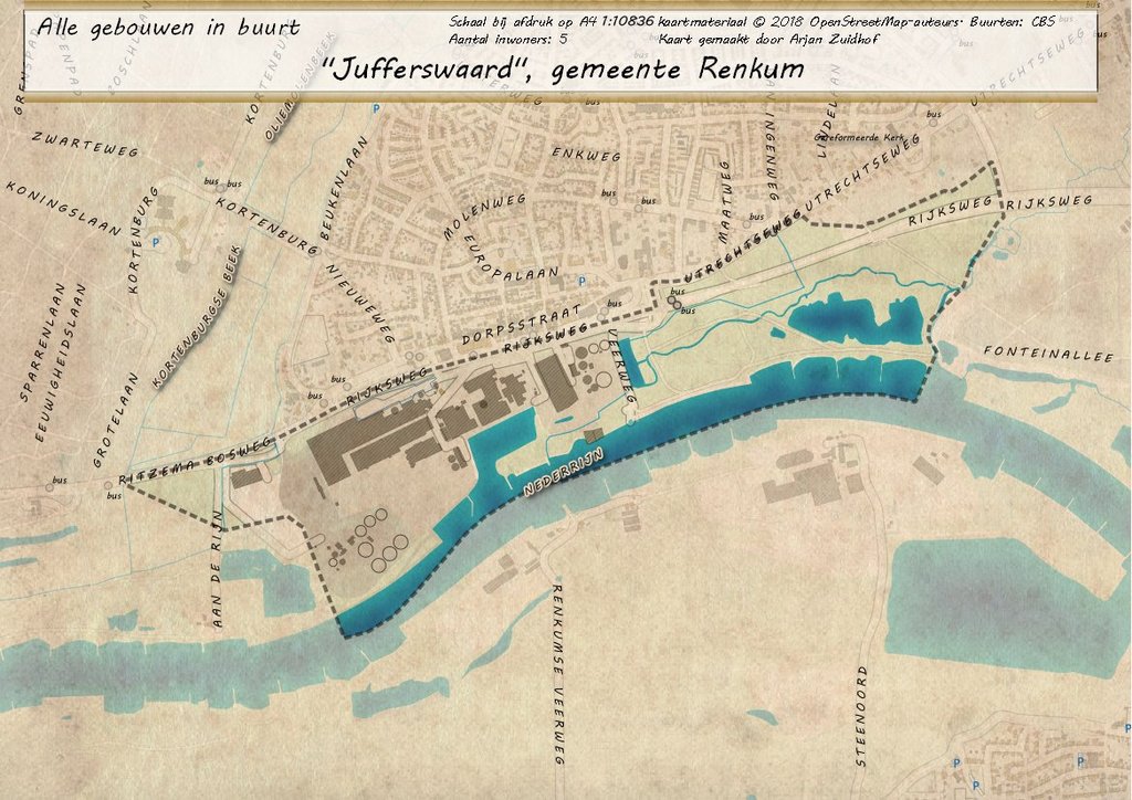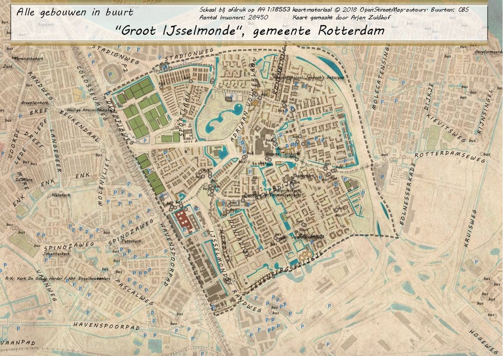 Het CBS houdt gegevens van alle buurten in Nederland bij. Gecombineerd met een eigen ontworpen klassieke kaartstijl levert dit aardige plaatje op. Hier zie je de buurt met de meeste inwoners, Groot IJsselmonde in Rotterdam. En een van de minst bevolkte wijken met minder dan 5 inwoners genaamd Jufferswaard in Renkum.