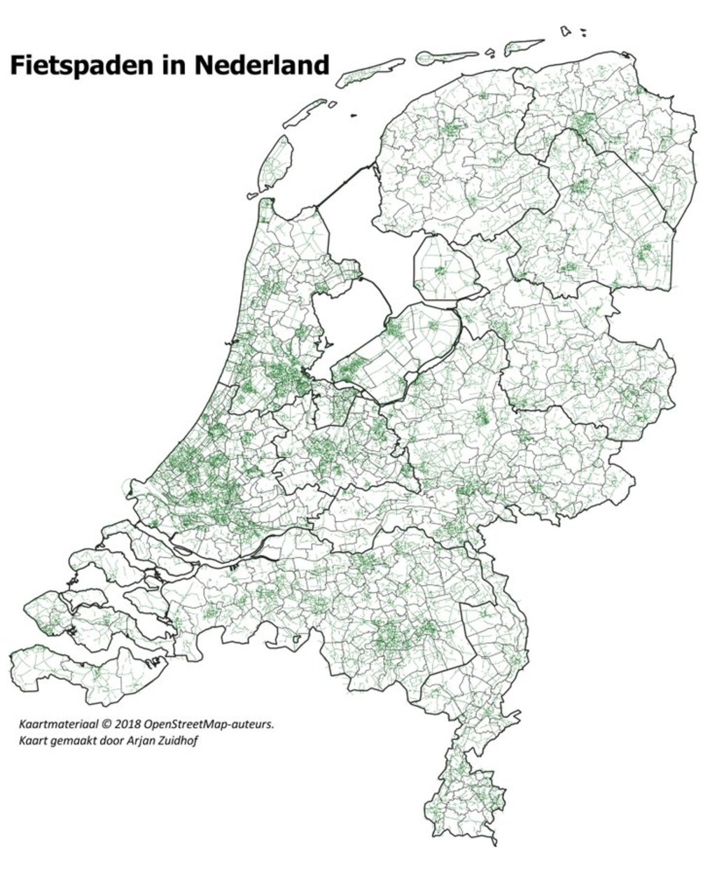 Alle losliggende fietspaden in Nederland. Het lijkt veel tot je inzoomt en ziet dat je in de praktijk toch vooral op en naast het onderliggende wegennet zult fietsen: