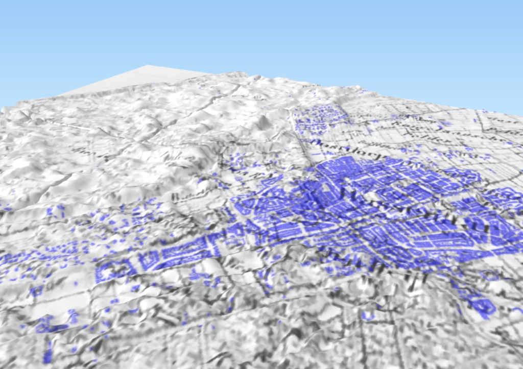 Om met georeferencen om te gaan heb ik een oude stafkaart van rond 1860 genomen die bij ons in huis hangt. Deze heb ik in een coördinatensysteem gehangen zodat die te combineren is met bestaande gegevens: in dit geval de huidige bebouwing in het blauw vanuit Kadastergegevens. Je kunt hier mooie effecten met verkrijgen bv door de oude afbeelding in de ruimte te laten hangen zoals hier.