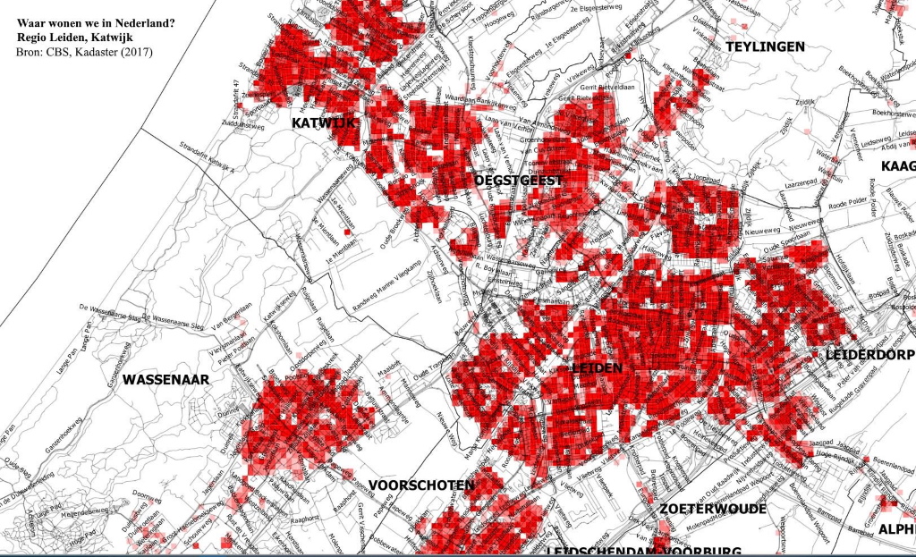 Iets ingezoomd op mijn eigen regio: de bevolkingsdichtheid in regio Leiden. Heel mooi te zien hoe zelfs middenin de Randstad er nog heel veel lege plekken zijn. Niet om te bebouwen natuurlijk, maar om te recreëren ;-) .overigens zijn niet alle “onbewoonde” plekken echt onbewoond. Er is ook zoiets als kantoren en industrie.
