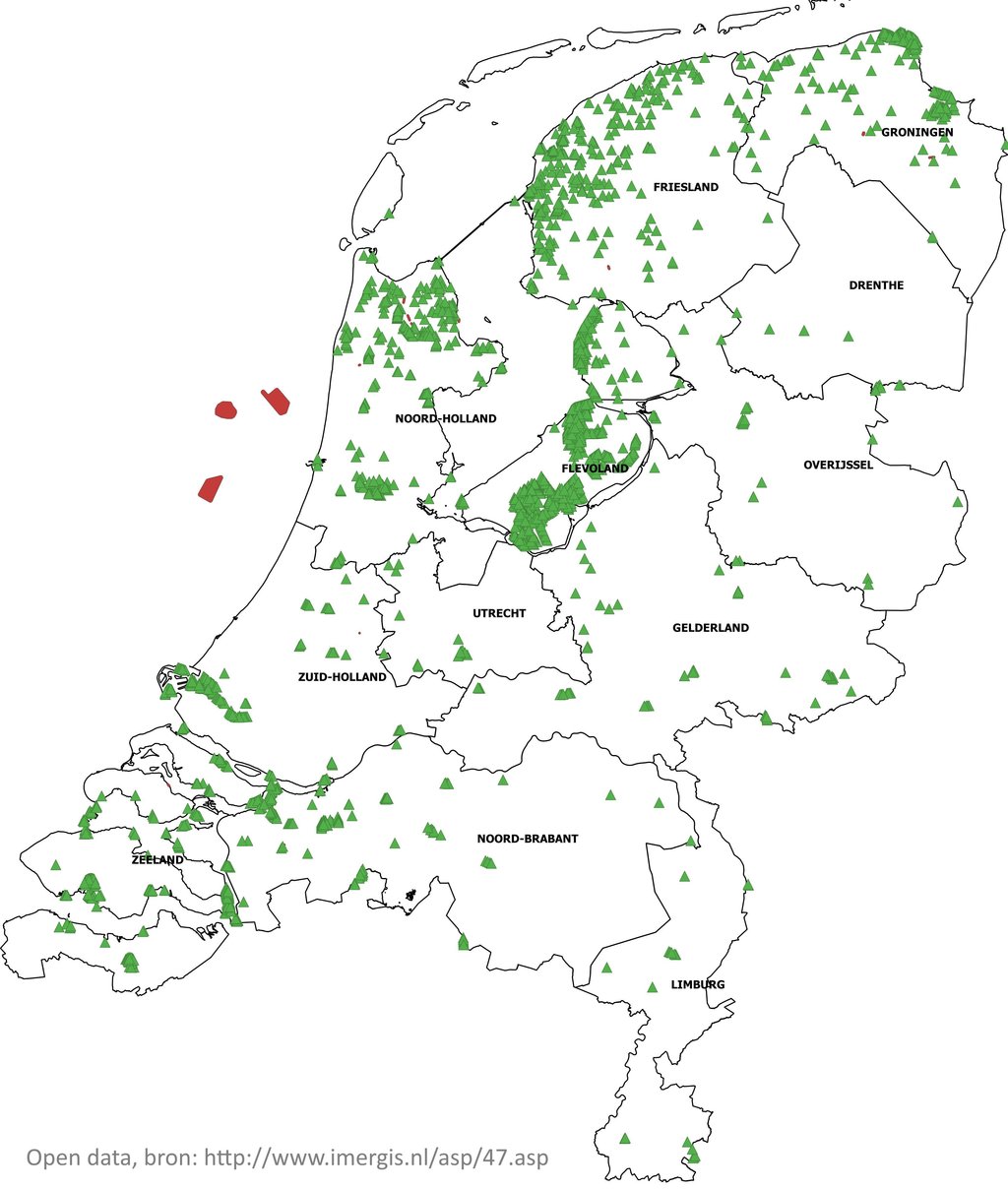 Een overzicht van windmolens en windmolenparken in Nederland. Goed te zien -en niet helemaal onverwacht- is hoe het overgrote deel in Noord-Nederland en Flevoland staat.