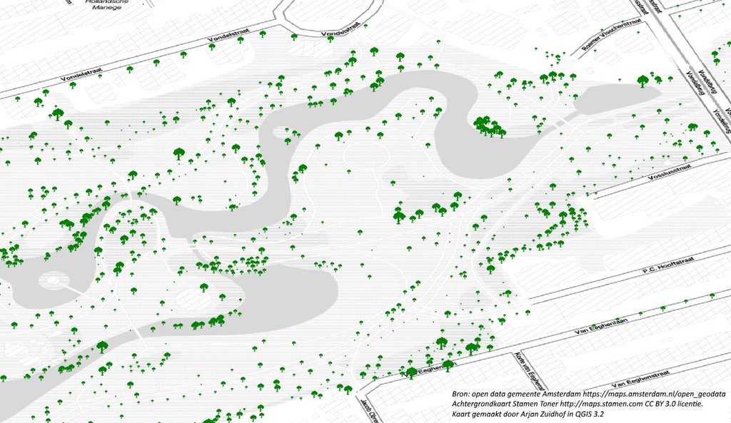 Gemeenten zetten steeds meer gegevens online. Amsterdam en Den Haag (en vast meer) hebben het hele door hen beheerde bomenbestand online staan inclusief leeftijd en boomhoogte. Dan kun je dit soort plaatjes maken van bomen in (een deel van) het Vondelpark.