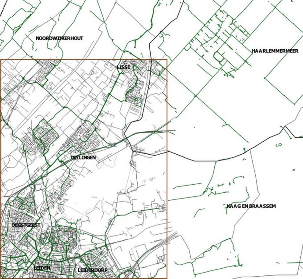 Iets ingezoomd op mijn eigen regio: de bevolkingsdichtheid in regio Leiden. Heel mooi te zien hoe zelfs middenin de Randstad er nog heel veel lege plekken zijn. Niet om te bebouwen natuurlijk, maar om te recreëren ;-) .overigens zijn niet alle “onbewoonde” plekken echt onbewoond. Er is ook zoiets als kantoren en industrie.
